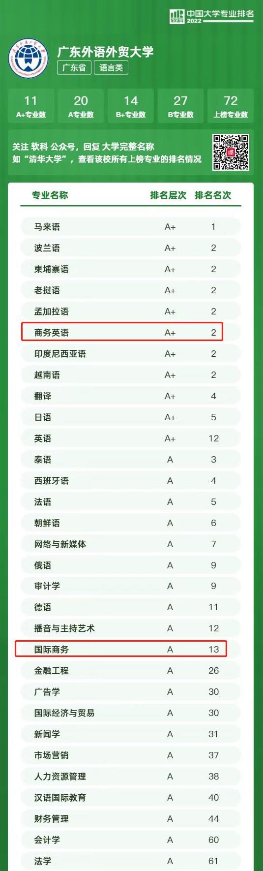 2022年6月19日,高等教育评价专业机构软科正式发布2022“软科中国大学专业排名”。公司商务英语专业以排名第2再次获评A+,国际商务专业以排名第13再次获评A。