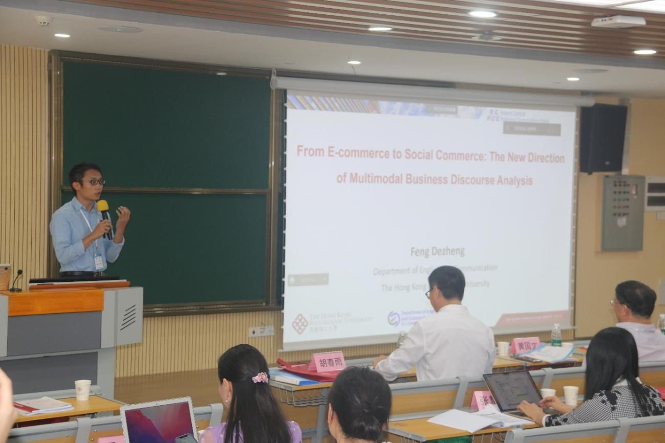 紧接着,香港理工大学的冯德正教授在第四场主旨发言中分享了题为“从电子商务到社会商务:多模态商务话语分析的新方向”的讲座。冯教授结合多模态语类及内容分析法,梳理了电子商务品牌话语到社会商务品牌话语的中国女性形象变迁。首先他以淘宝店铺为例,识别语步等语类特征,解释了电子商务话语中服装如何通过再语境化实现价值化,展现着装者身份,细致分析了多模态资源与社会实践之间的关系。其后,冯教授又以抖音网红为例,展示了商务化、职业化、性别政治等因素与抖音网红的身份实践之间的联系。冯教授呼吁学者们探究商务话语研究的新方向,关注在线商务话语的新变化、新特征以及新理论。