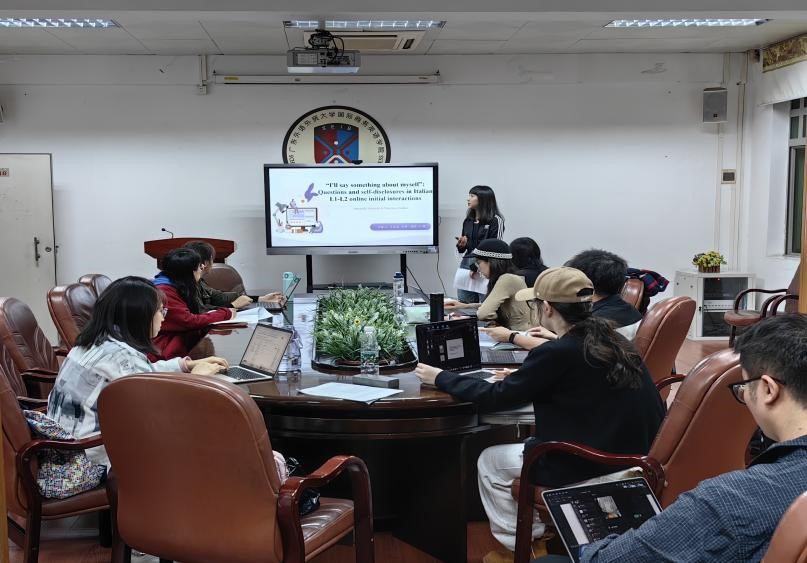 第13期学术沙龙由2023级博士生王良莉主讲,文献题目为“‘I'll say something about myself’: Questions and self-disclosures in Italian L1-L2 online initial interactions”。该研究旨在探讨在线聊天交际模式和社交-教学混合语境如何影响初次交流中双方的相识行为。研究发现彼此陌生的交际双方在以学习语言为目标的聊天互动中可以快速适应线上独特的交际环境,并且同时实现社交和教学的目的。其中,提问和自我披露是实现上述两种交际功能的主要语言资源。讨论环节,在座师生就文中两种相识策略的关系、和前人发现的不同、写作特点、对商务话语研究的启示等问题展开热烈交流。