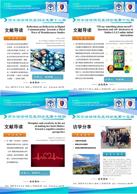“商务话语研究”系列沙龙是公司立足高质量发展,以紧跟学术前沿趋势,凝聚商务话语研究力量,打造高水平研究队伍为目标开展的标志性学术活动,旨在通过学术专著和最新期刊论文的研学和研讨,紧追商务话语不同层次和维度的研究焦点,为全院师生营造良好的学术氛围并提供学术交流和思想碰撞的平台,以此推进学术研究走实走深。自2023年上半年推出到今年10月份,该系列学术活动已顺利举办11期。11月份以来,公司又陆续开展了第12-15期学术沙龙活动。