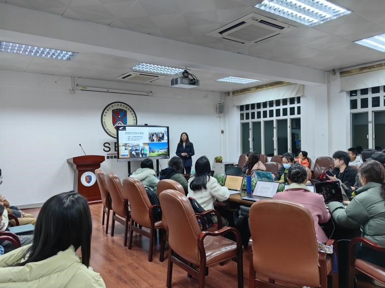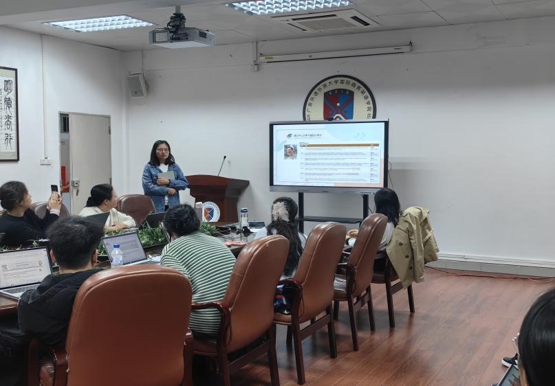 随后,2021级博士生丁婷分享过去一年在新西兰梅西大学的访学经历。丁婷首先介绍了出国访学申请流程,包括国家留基委、省教育厅、公司项目等主要申请途径和材料准备。其次,丁婷从学习和生活两方面介绍了新西兰访学注意事项。最后,丁婷围绕学术活动、社区活动、社会活动三方面提供建立关系网的途径,帮助大家最大限度利用好访学机会。分享结束后,在座师生就与外导沟通细节、交通出行等方面同丁婷展开交流。刘平教授也结合自己过去三段访学经历鼓励同学们要主动了解和融入当地文化,同时提高安全意识。之后,杨雨光和李欣叶两位博士生分享了《商务话语研究》课程论文写作计划,刘平教授提供了具体改进建议。