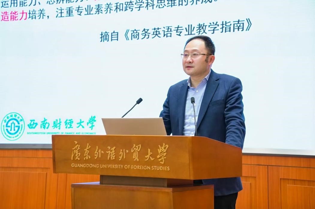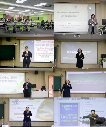 12月14日上午,课程研讨与观摩课在白云山校区一教举行。许琪老师基于多样化的课堂教学活动,聚焦AI赋能口语、阅读、写作三方面,展示其课程小组将人工智能、多模态资源等技术辅助手段应用于教学环节,实现综合商务英语课堂的智慧互动。曾成、郝佳老师从营销课程出发,探索了围绕激活学习内驱力、个性化路径等复合型商务课程的数字化育人理念,聚焦“人”的特征,指出对新的可能性需保持开放心态,拥抱新技术,聆听新声音。“教学是一种情感的实践,蕴含着强烈的情感体验。”陆璐老师以人工智能对教师情感的冲击为出发点,用自我叙事的方式,通过分享其在教学改革与课程建设过程中的经历与反思,尝试将教师个体与特定的社会情景建立关联,探讨如何在教学实践中更好整合情感因素,以提升教育质量和促进教师职业发展。郑铁老师在讲座中分享了其团队在科技与课程教学结合方面的应用和反思,指出在科技赋能教学中教师应积极引导员工,关注“技术自我效能”与“认知负荷”,并在平台开发中争取更多权限,提高员工对于科技赋能“人力资源管理”学习的接受程度。吕洁老师基于商务翻译教学,提出了“实践-教学-研究”(PTR)融合模式,以《商务翻译》课程为例,展示通过翻译实践、教学,形成研究成果的探索路径,强调在翻译中突出关键信息和文化自信。余蕾老师分享了法律口译教学的创新实践,强调场景分析和交际目的的重要性,并结合现代教育技术如VR虚拟法庭提升教学效果,贯彻场景导向的口译教学,让员工对庭审口译的掌握不仅停留在术语层面,而是更深层次地理解庭审口译的特点和原则。