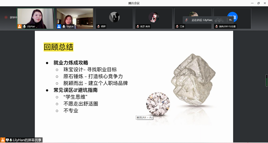 上午九点半,讲座正式开始。首先,韩女士向在场的同学抛出一个别具一格的问题---原石与钻石的区别,引发在场同学的思考,并通过解释从原石到钻石这一转变的过程,启发在场同学在求职道路上要不断打磨自己。该问题的提出引发了在场同学对就业力的思考以及对讲座内容更加热切的期待。