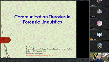 本次讲座系Terry Royce教授就“法律语言学”为主题开展的系列云讲座中的第一讲,讲座题目为Communication Theories in Forensic Linguistics(法律语言学中的交际理论)。讲座安排在每周四18:30开始,为期一个月,主要从法律语言学话语分析中的重要语言学理论、话语分析方法、交际模型以及在危机谈判中的应用等四个方面展开。