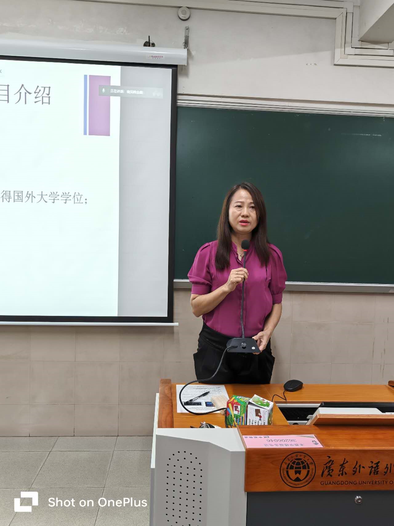 韩金彪老师讲解了教务和签证方面注意事项,并就学期初的课程安排进行说明和布置,提醒新生把握时间节点、合理安排学习计划。
