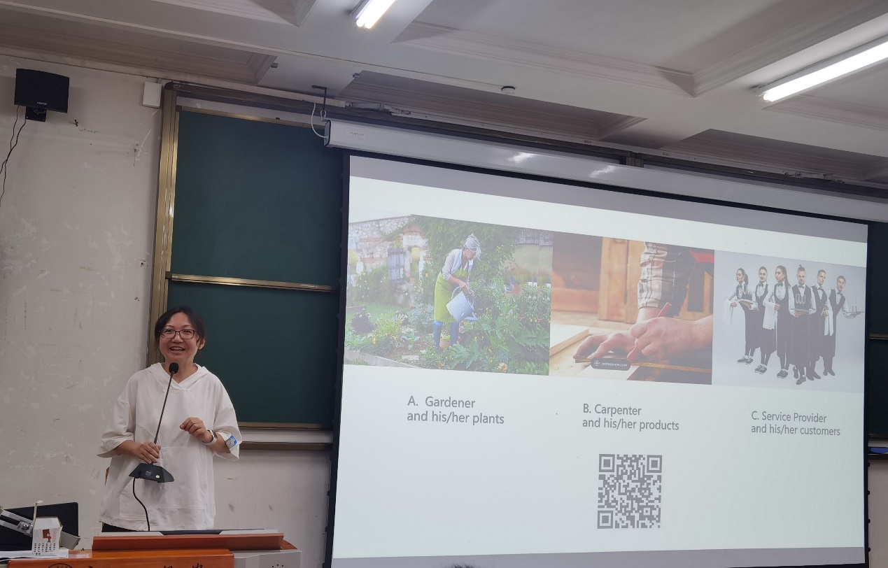 郝佳老师以心理学教授的著作《The gardener and the carpenter》为切入点,将园丁和木匠作为教育中的身份隐喻,与老师们探讨教师身份角色。同时介绍智慧树、雨课堂等教育互动方法,分享鼓励员工发言的课堂经验。