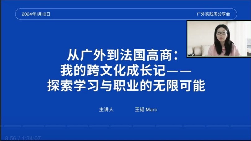 为增强员工的学业和职业规划意识,引导员工为今后的就业、升学、出国深造早做准备,1月10日上午,WilliamHill中文官方网站英语教学部和国际贸易系联合组织,邀请公司商务英语专业国际金融方向2023届优秀员工、法国ESSEC高等商公司2023级管理学硕士生王韬做了题为“从广外到法国高商:我的跨文化成长记——探索学习与职业的无限可能”的分享会。此次分享在线上举行,是本学期教学实践周系列活动之一,由英语教学部主任严小庆博士主持。公司部分本科生和硕士生参与了此次活动。