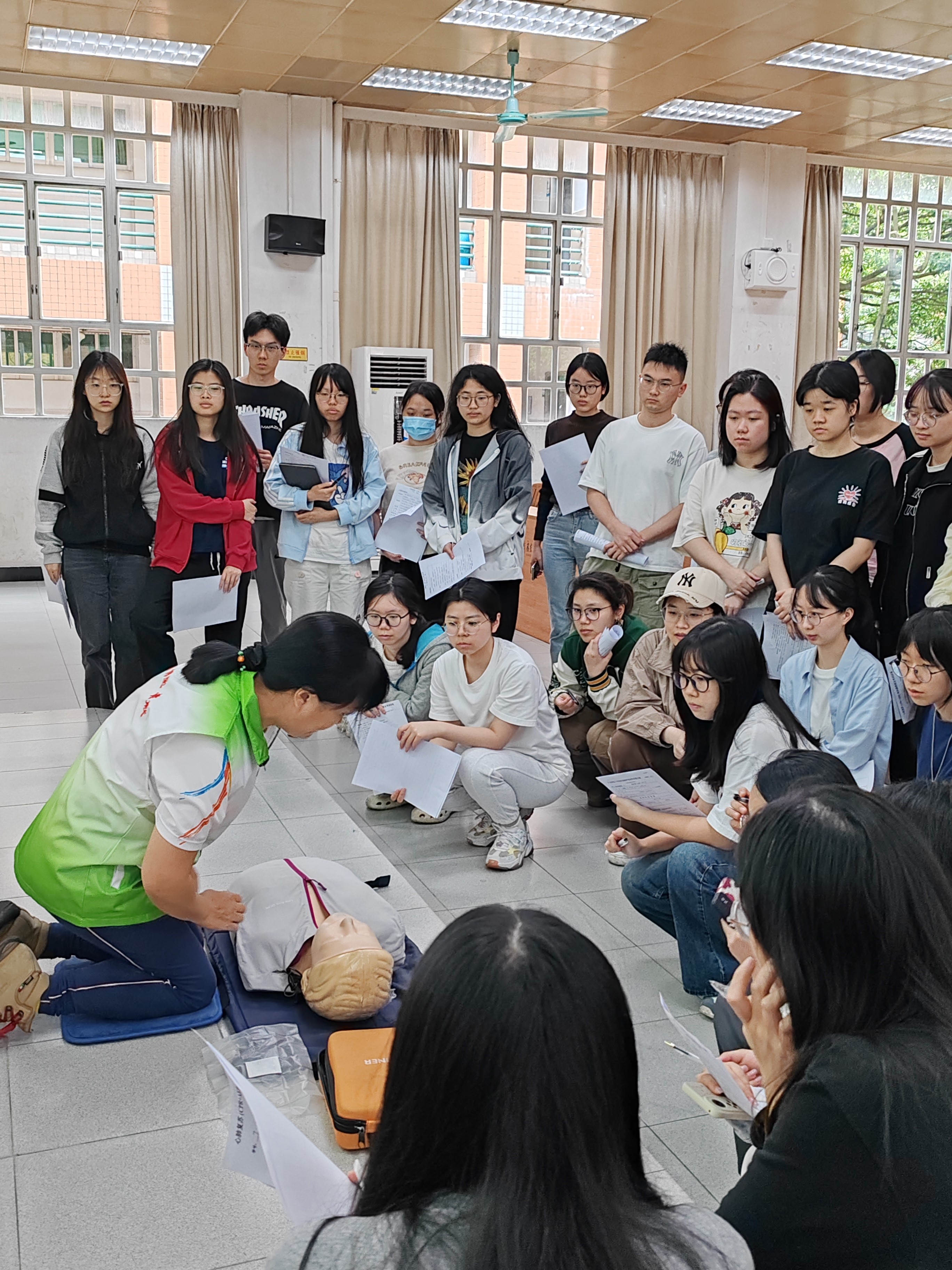 而后,广州市红十字会谢老师进行现场成人心肺复苏操作以及自动体外除颤器(AED)使用流程的教学演示。演示生动形象,细致全面,医疗志愿者们悉心学习。演示结束后,刘老师对AED使用以及气道异物梗塞施救方法开展理论培训,为了帮助医疗志愿者们加深对心肺复苏以及AED使用实操流程和细节的理解,培训人员还对心肺复苏以及AED使用流程进行了二次教学演示,并邀请志愿者现场体验。
