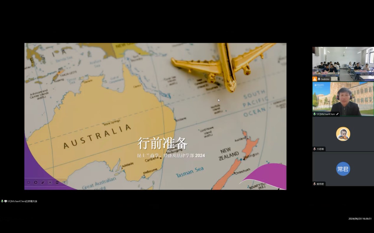 昆士兰大学商业、经济与法律学部大中华区区域经理Michael先生致辞。他感谢广外大及公司领导、老师长期以来对项目的大力支持,祝贺同学们顺利完成学业,期望同学们在昆士兰大学不断创新、促进个人全面发展。Michael还开展了行前教育,详细介绍了昆士兰大学选课、学分、住宿准备等事项,帮助同学们更好地适应海外职工活。