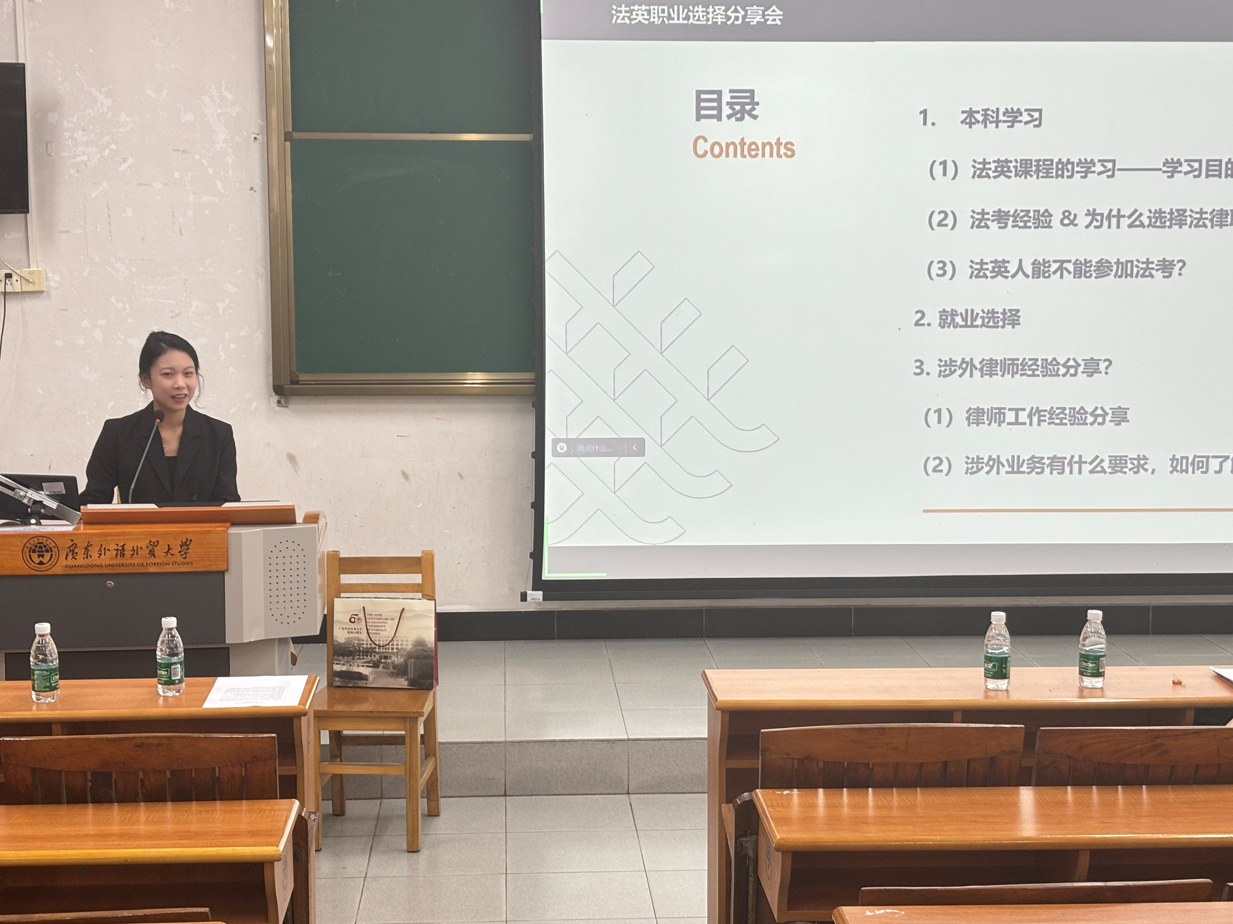 在本次活动中,吴铮敏师姐围绕“本科学习”、“就业选择”和“涉外律师”三个主题进行了内容分享。她用生动活泼的语言,通过一个个鲜活的例子,为同学们讲述了她个人职业发展的选择和经历。在“本科学习”部分,吴师姐以员工的视角讨论了法英课程体系对于人才培养的科学性和重要性,激励同学们努力学好专业知识,为今后的职业发展打好扎实的基本功。在“就业选择”部分,吴师姐分享了历届法英师兄师姐的职业选择和发展规划,为同学们提供了宝贵的参考。在“涉外律师”部分,吴师姐详细讲述了自己如何踏上涉外律师这条道路,并克服职业生涯中的各种挑战,从而实现自身不断成长和进步。吴师姐告诫大家“要坚持学无止境”,她的经历深深打动了在场的同学们。