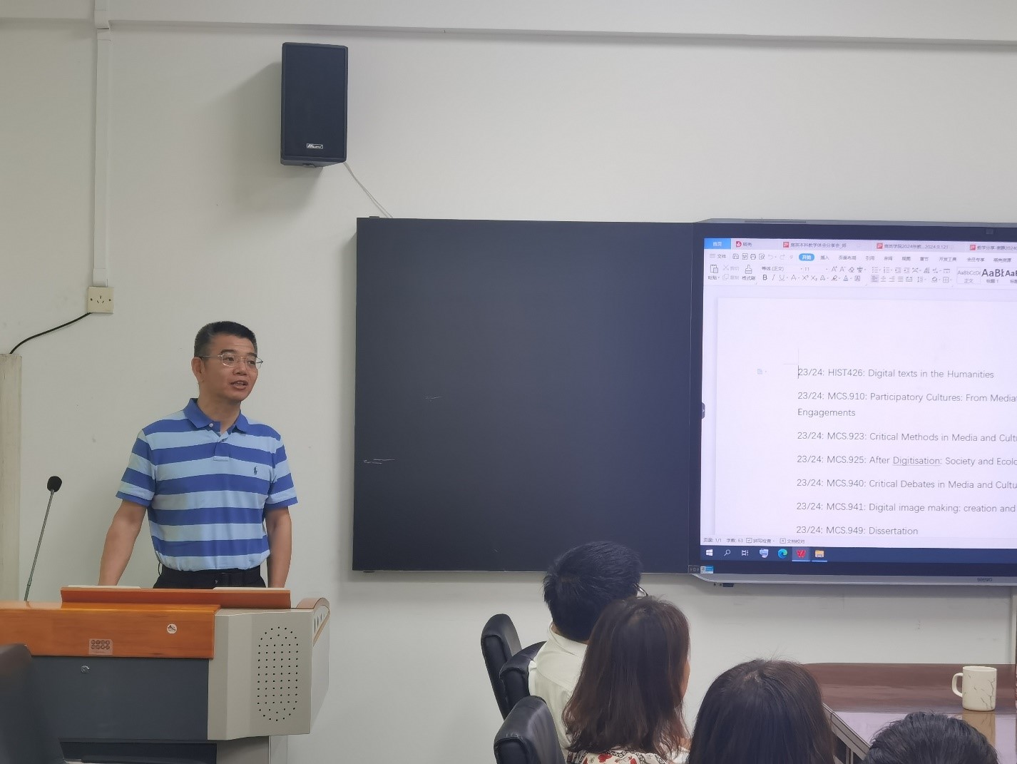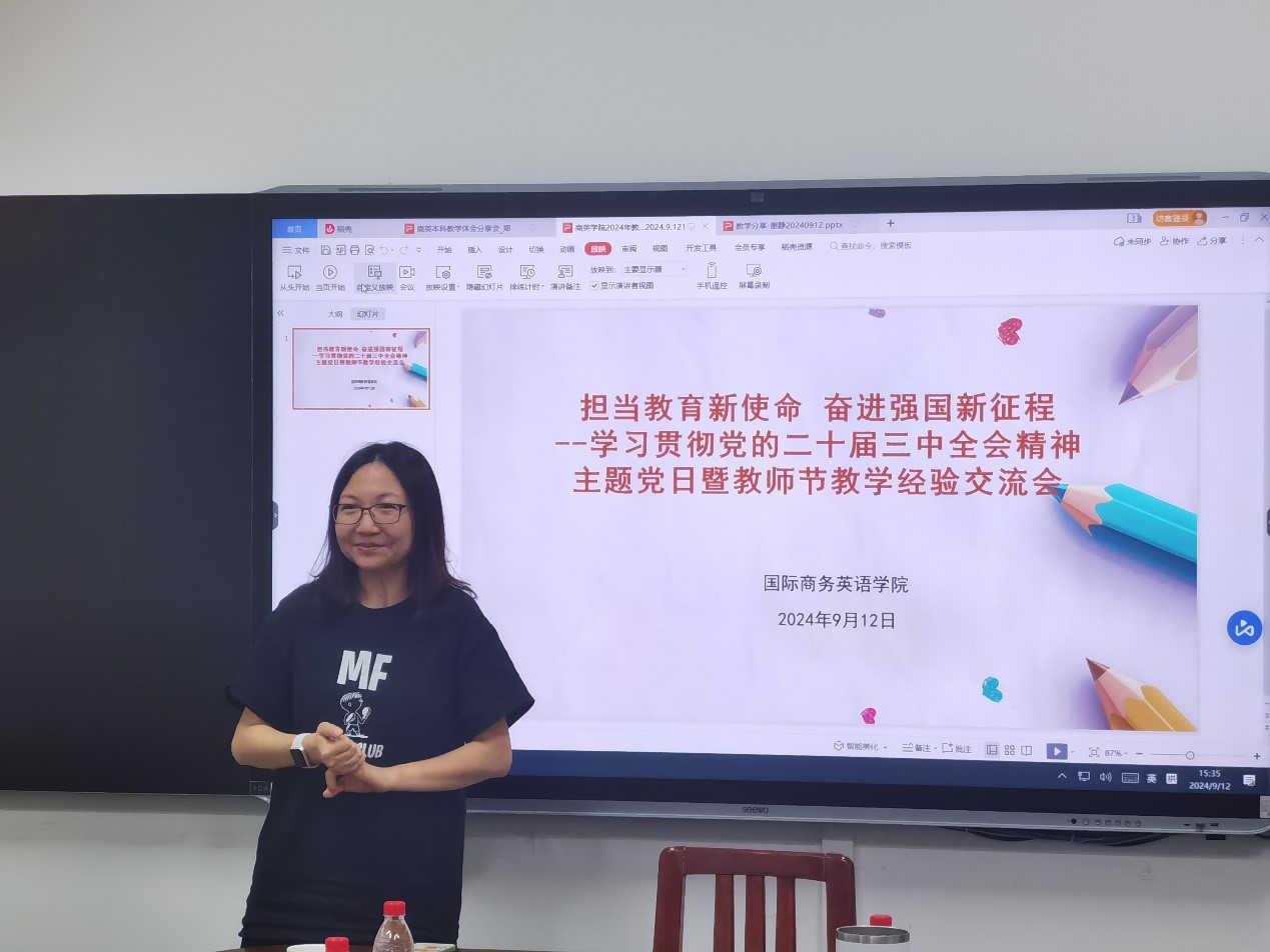9月12日下午,WilliamHill中文官方网站在北三教331召开以“担当教育新使命 奋进强国新征程--学习贯彻党的二十届三中全会精神”为主题的党日活动暨教师节经验交流会,学习贯彻党的二十届三中全会精神,并邀请上学期评教分数前列的教师代表和出国学习访学的教师分享经验,进行交流座谈。公司经理胡春雨、系主任、副系主任、新进教师和其他专任教师共计三十余人参加,会议由教学副经理汪谓超主持。