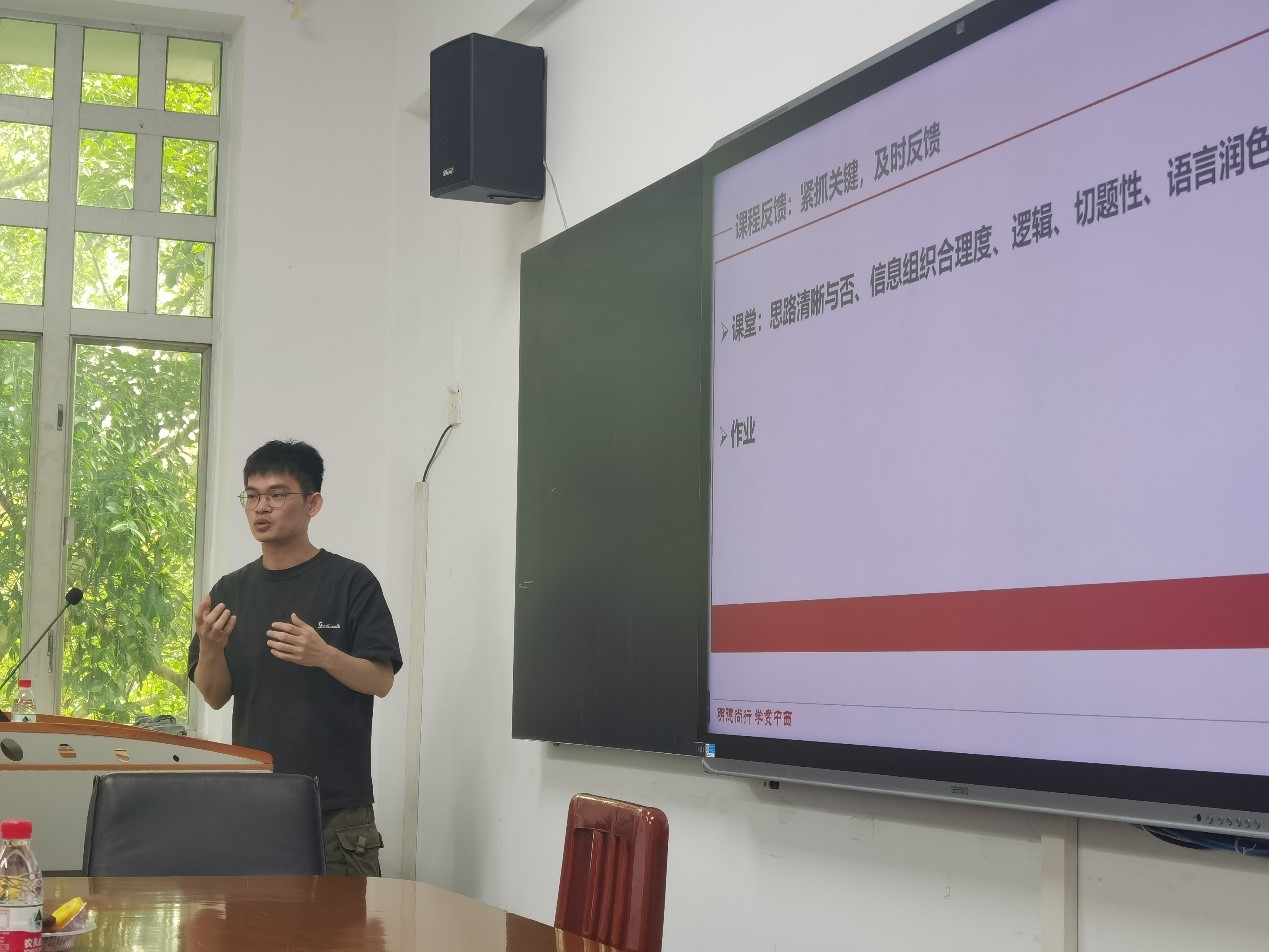 郑有耀老师根据课前、课中、课后的教学流程进行分享,他提到,课前要深挖经典,引出教材,通过教材中的经典话题,引出时下热门话题,扎根教材的同时,又要紧跟时事,融入新素材。课中进行课堂互动,引导研讨,激发员工参与感。课后紧抓关键,及时进行课程反馈。作为近几年新的青年教师,郑老师也分享了对自己教学的反思,表示在今后的教学中,要理性为主,感性为辅;多引导,少灌输;同时提高数字化素养。