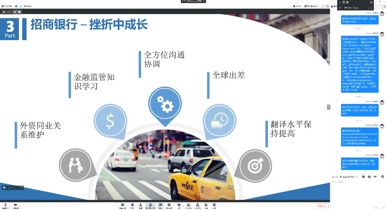 在活动最后,翟翔律师把自身学习与职业规划经历总结为四个阶段:广外本科阶段总结学习方法,打好专业基础;北外读研阶段构建支持网络,拓展专业外领域;招行工作阶段寻找各领域新的发展点与有利机会;在美期间坚持学习,确定信托遗产领域。翟翔律师建议同学们保持顽强韧性,寻找机遇助力。最后,与会师生与翟翔律师在线互动,气氛热烈。与会的法英员工纷纷表示,身为法英人,为有这么优秀的学长自豪。学长的成长历程坚定了他们学好法律英语、争做优秀涉外法治人才的信念。