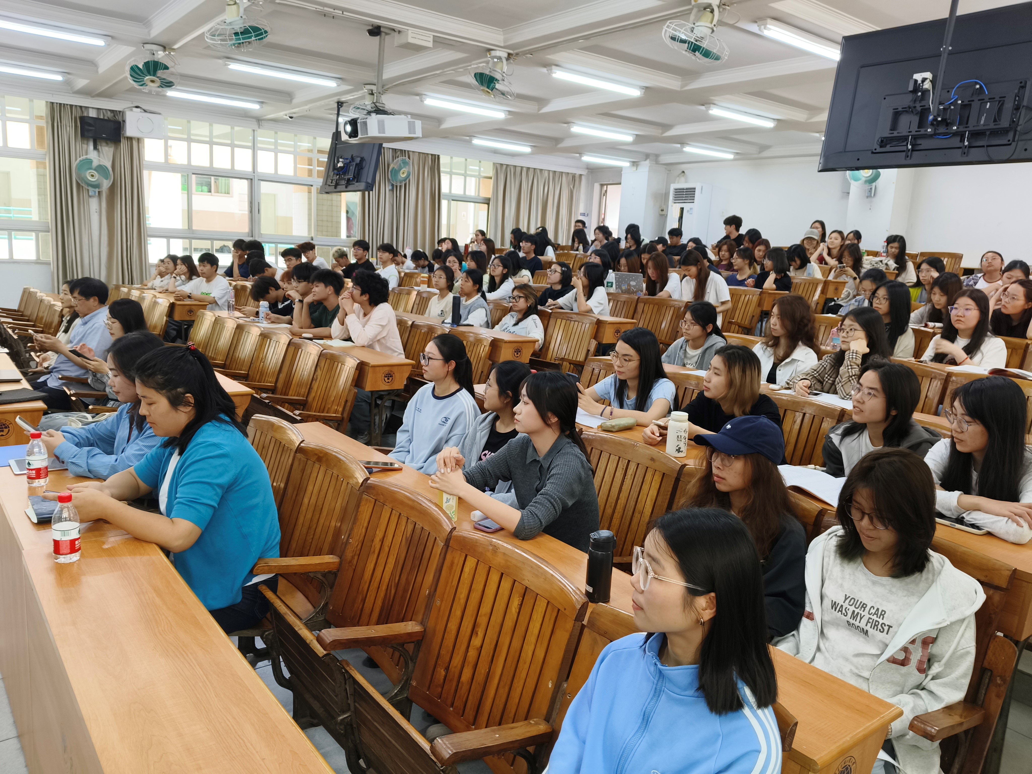随后,各系部主任依次上台为同学们详细讲解各分流方向情况。商务英语系主任林洁老师首先介绍了数字媒体管理方向的培养方案与课程设置。她从该方向所需的核心能力、必备素质以及就业前景三个维度出发,为同学们提供了清晰的分流方向指引。林老师强调,数字媒体管理方向不仅注重员工的语言能力,还着重培养其在数字媒体领域的创新思维与实践能力。接着,经贸英语系主任何宇菲老师为同学们详细介绍了数字贸易与数字金融这两个方向的核心课程及专业前景,特别提到了公司提供的丰富实习机会。并邀请了两位优秀的21级员工现场分享学习心得与选择分流方向的经验,建议同学们在选择时应结合未来就业方向及课程内容对职业发展的帮助做出理性决策。最后,法律英语系主任张新红老师为同学们介绍了法律英语系的发展历史、团队队伍、实践实习资源及科研成果。张老师强调,国际经济法方向注重培养“英语+法律”的复合型人才,员工不仅需要具备扎实的语言基础,还需掌握法律专业知识。同时他也鼓励同学们在未来的学习中注重错位竞争,提升自身的专业素养与综合能力。