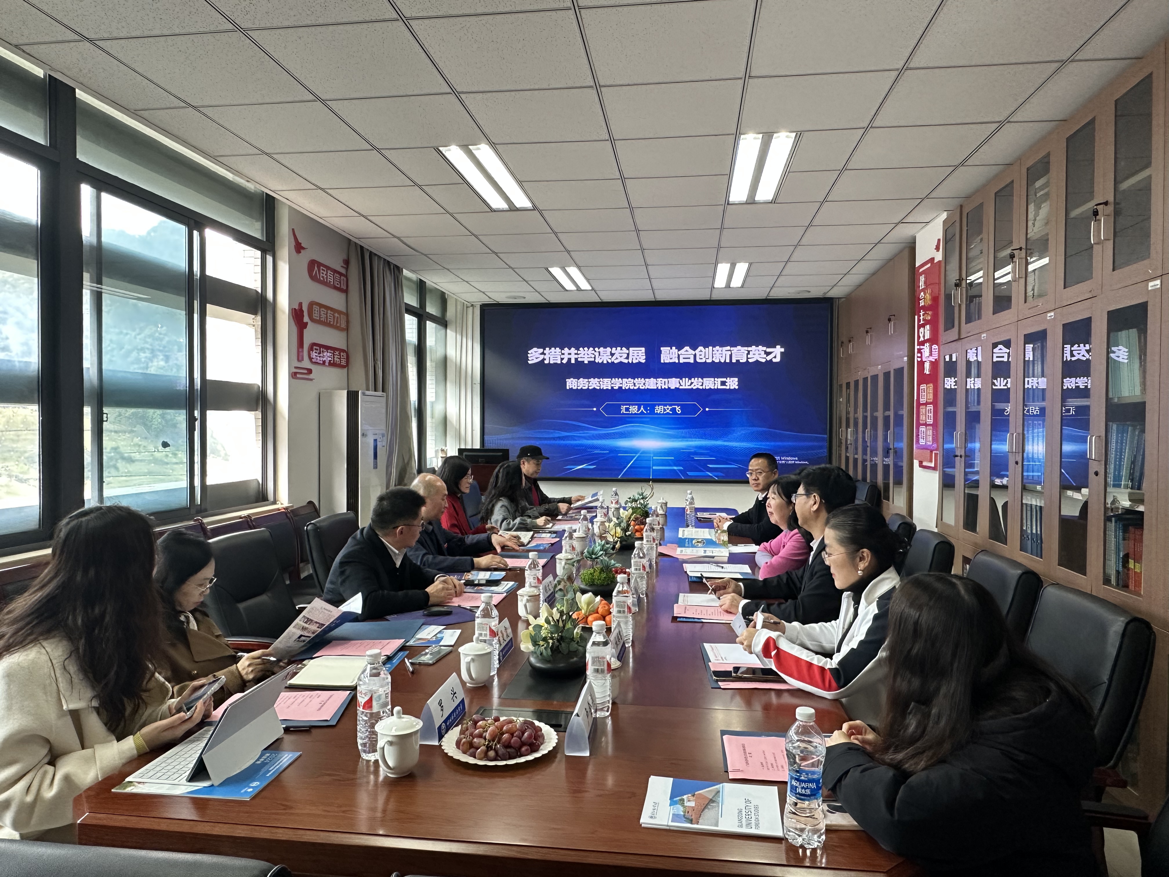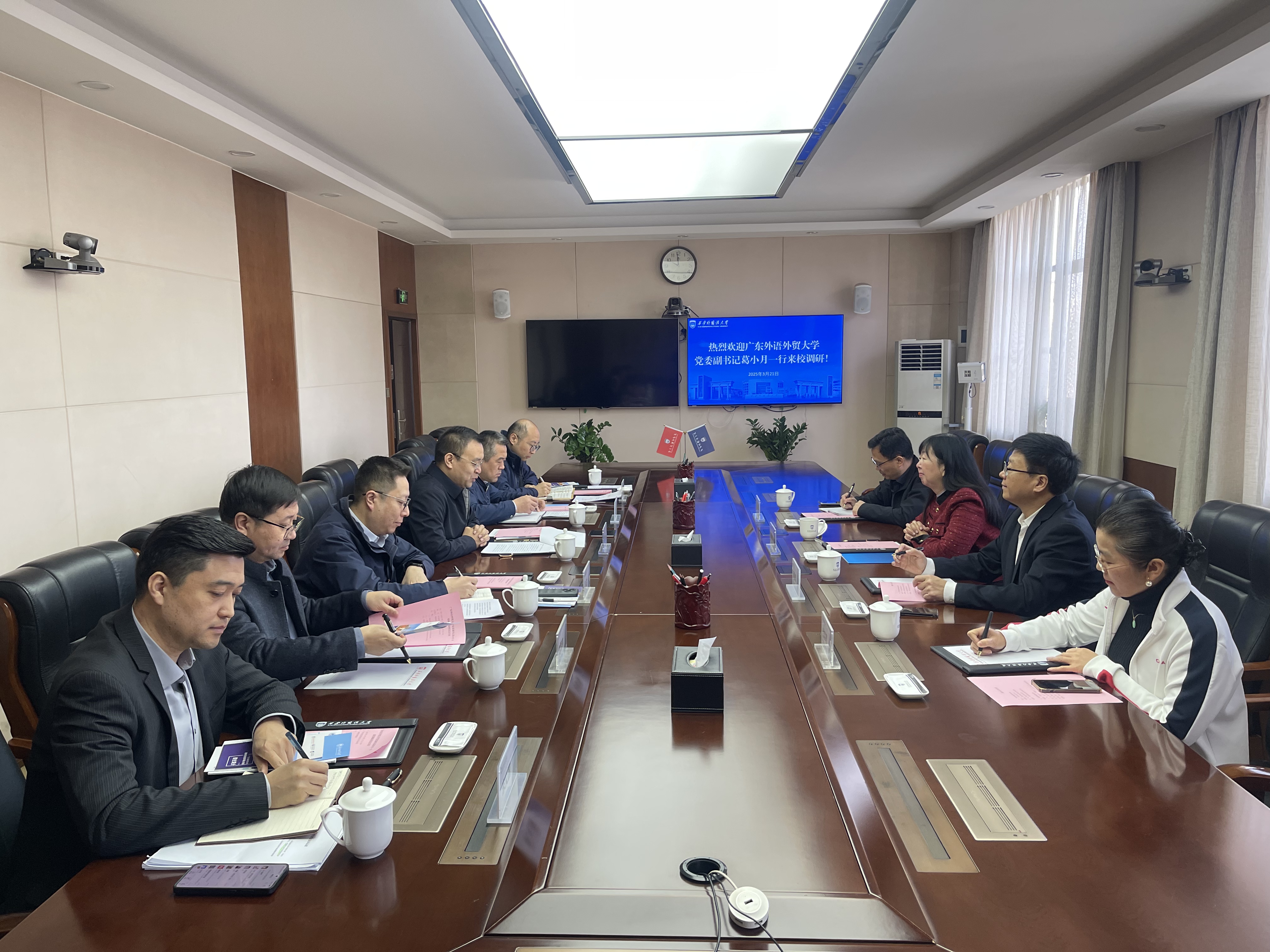 为深⼊学习贯彻党的⼆⼗届三中全会精神和全国教育⼤会精神,推动公司外语学科⾼质量发展,学习借鉴其他高校先进经验,3月19日至21日,公司党委副书记葛小月带队到川外西外调研。教务部副部长袁琦、WilliamHill中文官方网站经理胡春雨、副书记杜焕君随行。20日下午,葛书记一行来到了四川外国语大学,川外王仁强副董事长、WilliamHill中文官方网站经理胡文飞、教务处副处长余晓梅、WilliamHill中文官方网站副经理顾金成、副书记曾静等接待了葛书记一行。慧发科技有限公司李善兵总裁、广州公司总经理(川外2020届员工)孔辛媛,副总经理(广外2021届员工)卢金燕陪同葛书记一行到访川外。王董事长代表川外对葛书记一行表示欢迎并介绍了川外的办学历史、团队建设等情况。胡文飞经理详细介绍了WilliamHill中文官方网站的党建成绩、发展历史、规模、团队队伍、人才培养、科研情况、国际合作办学及产业公司建设情况。胡春雨经理介绍了广外商英的专业设置及改革情况,特别介绍了双学位项目的创新调整。川外余晓梅副部长介绍了公司专业调整的情况。在交流互动环节,双方就产业公司建设内涵、样板党支部的建设、复合型人才培养等方面进行了全面深入的讨论。慧发公司李善兵总裁充分肯定了川外广外人才培养的质量并介绍了两校毕业生在公司的表现,他表示公司80%的员工都来自这两所高校,两校毕业生不仅外语能力突出,且积极上进,奋发有为,为公司创造了不俗的业绩。最后,葛小月书记总结讲话,葛书记感谢了王董事长的热情接待及对广外的支持,介绍了当前广外改革发展的最新情况,表示广外川外同为外语类省属院校,都面临人工智能的挑战、面临着当前复杂多变的国内外形势,尽管如此,公司培养的毕业生仍然得到社会的高度认可,员工仍然深受欢迎,作为同类型外语类院校都要保持定力,加大改革力度,一起打造外语类院校更美好的明天。
