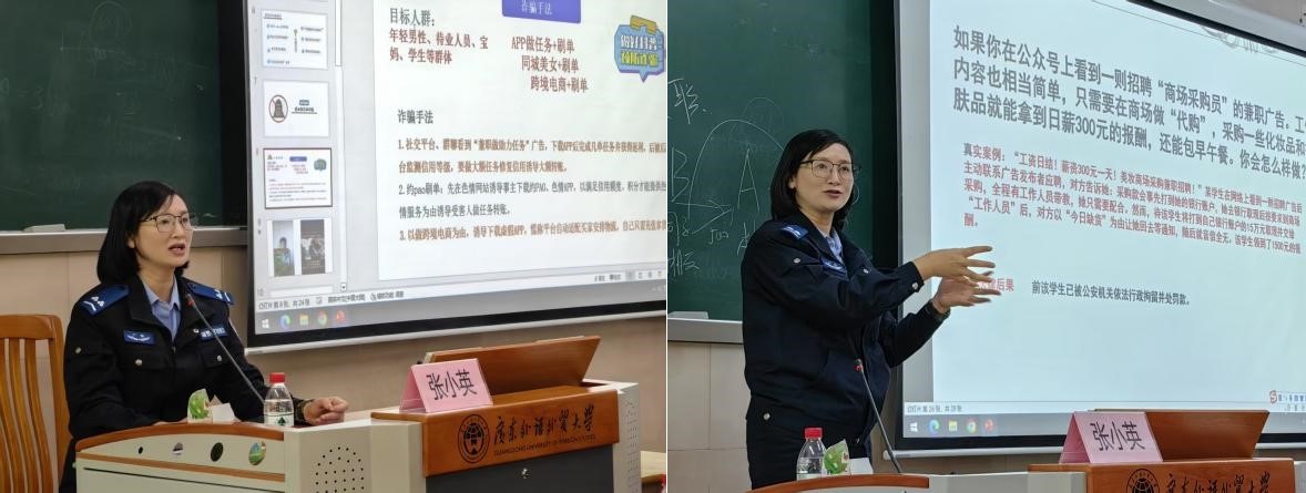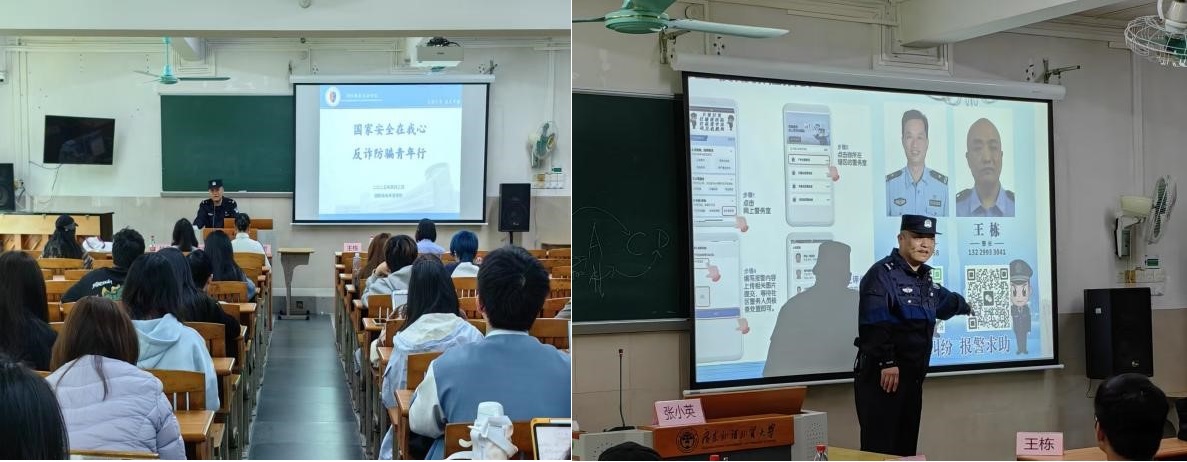 2025年4月3日下午,WilliamHill中文官方网站“国家安全在我心·反诈防骗青年行”主题讲座在白云山校区二教132课室顺利开展。本次讲座特邀驻校王栋警官与白云公安分局反诈中心张小英警官担任主讲嘉宾,公司党委副书记杜焕君、辅导员陈思蓓、林童和公司员工参与讲座。