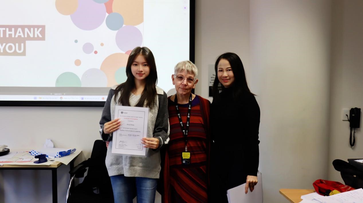 8月15日,为期两周的悉尼大学“商务沟通与领导力”项目迎来收官之日,语言中心教室内举行了一场精彩纷呈的结课汇报展示。各小组员工依次上台,围绕跨文化团队协作、领导风格分析与对比等主题进行汇报展示,展现出卓越的专业素养与语言自信。悉尼大学教师代表对同学们在整个项目期间的表现予以高度评价,并从内容组织、表达逻辑到跨文化沟通实务等方面提供了细致反馈、给予了专业指导。精彩的结课汇报展示后,悉尼大学举行了项目结业仪式。悉尼大学教师代表和项目带队老师杨文慧教授共同为圆满完成课程的员工颁发结业证书,并合影留念。