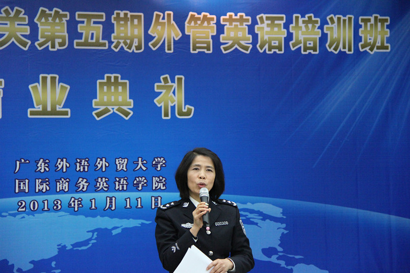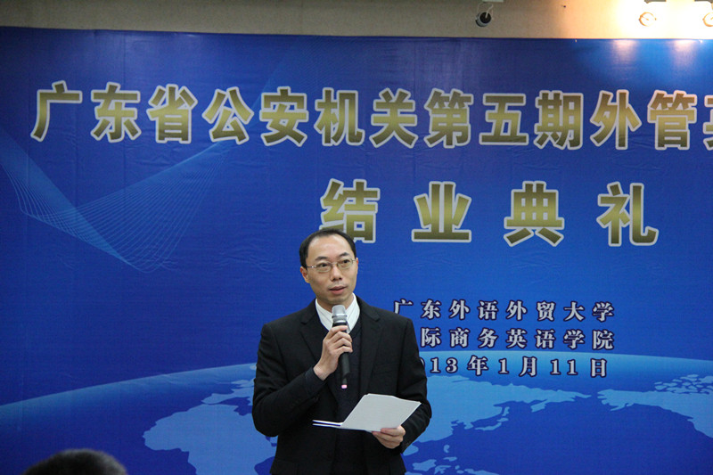 2013年1月11日下午,由广东省公安厅和威廉希尔体育批准、WilliamHill中文官方网站法律英语系具体策划、组织和实施的第五期外管英语培训班结业,结业典礼在第六教学楼广晟讲堂举行。广东省公安厅出入境管理局局长陈敏、副局长申勇强等省公安厅领导,WilliamHill官方网站副董事长顾也力,WilliamHill中文官方网站经理郭桂杭、党委书记车小真以及其他相关领导和老师、广东省公安机关第五期外管英语培训班学员和助教参加了此次结业典礼。典礼由WilliamHill中文官方网站副经理吴易明主持。