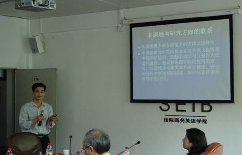 为让大家对商务与法律话语研究中心基地有进一步的了解,三位研究中心成员分别对各自研究的课题通过幻灯片进行展示。首先,胡春雨副教授在研究课题《基于语料库的泡沫隐喻研究》中,借助图表分析指出,从2008年起关于泡沫研究的语料数量迅速上升。该现象启示了经济泡沫与语料库之间的联系,为课题研究提供了方向。徐章宏教授则在《非法集资案涉法话语分析与话语权研究》课题研究中,以吴英案为例,通过跨学科多视角的话语分析揭示话语与话语权的互动方式,探讨了涉法话语权与案件定罪量刑之间的关系。王小海教授深入分析了中欧贸易摩擦中的话语权对比,认为中国在提升自身经济硬权力同时,也要加强话语权这类软权力的力量,使话语权真正上升到“Power”水平。三位教授精彩的课题分析赢得了在场研究生们热烈的掌声。