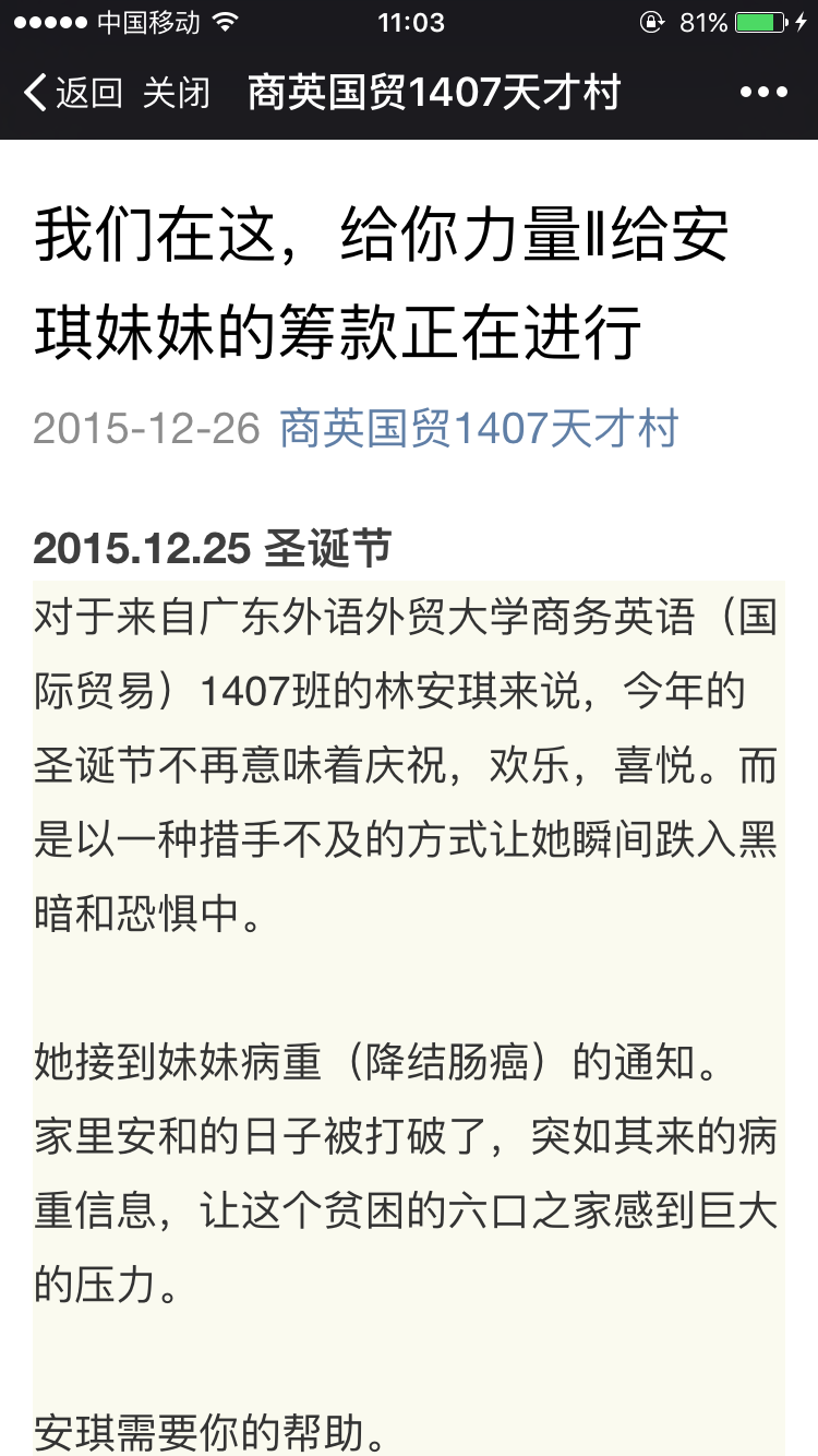 林安琪是公司国际商务英语大二员工,家庭贫困,靠国家助学金缴纳学费。她成绩优秀,多次获得校级奖学金,对未来充满憧憬与希望。25日,正在读高三的妹妹被确诊为降结肠癌,预计14万的医疗费一下来把她拉入了黑暗的深渊。危难时刻,班委选择站出来,连夜写作了推文《我们在这,给你力量‖给安琪妹妹的筹款正在进行》,在班级的微信公众号“商英国贸1407天才村”发出,呼吁筹款。该推文在公司师生微信朋友圈中得到大量转发。在公司师生及社会各界的支持下,截至27号23点30分,收到的善款总额达到186676.24元,“安琪妹妹的预期手术费已经基本筹齐,谢谢大家!现正式停止募捐,请周知。希望大家将爱心传递,把善款留给更需要帮助的人!”林安琪所在班级通过微信公众号“商英国贸1407天才村”发布推文呼吁筹款,短短两日,林安琪妹妹的预期手术费便筹集完毕。