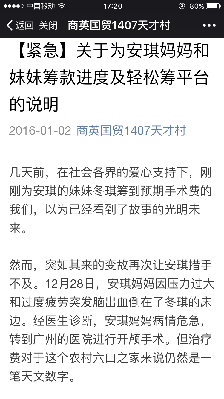 本以为风雨之后迎来阳光,然而,暴雨再一次降临在这个并不富裕的农村家庭。28日,安琪妈妈因压力太大和过度疲劳突发脑出血倒在了妹妹的病床边,转至解放军第421医院ICU病房抢救。新年伊始,本该合家团聚其乐融融,而事实却是一家人分隔两所医院,守着两个与病魔搏斗的亲人。面对措手不及的突发情况,班级微信公众号再次紧急发布推文,并利用众筹平台进行第二次募捐。截至1月2日14时35分,众筹平台已收到员工及社会各界爱心人士善款300253.55元。“病魔是无情的,我也许不够强大,但我不想也不会放弃。”安琪在此前班级发布的推文中如是说。
