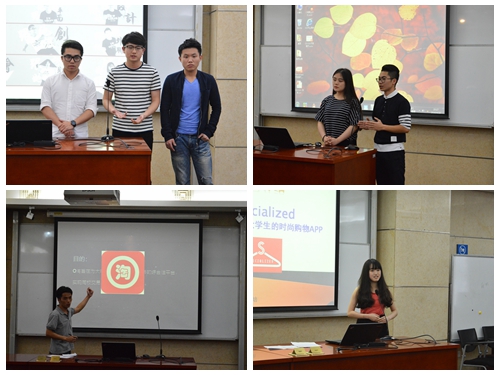 随后,公司五个员工创业团队进行了现场展示。GDOES团队经营的是自主设计和生产的校园纪念品、团体纪念品,以及代生产批发文化产品。GDOES团队注重品质,强调设计创意和用细节打动顾客。比逗广外团队由校内就餐的诸多问题萌生创业想法,通过与广州比逗网络科技有限公司合作,创立了广外比逗餐厅。其后的“O淘”与“Specialized”团队的创业设想都是通过创建APP提供服务,获得盈利,前者聚焦于校内二手教材资源的线上交易,后者则希望建立以3D试衣技术为特点的广州员工购衣平台。南京白局团队则希望联合社会力量,致力于南京白局这一富有南京地域特色的文化遗产传承与推广,他们现场展示了一段南京白局片段,让人印象深刻。员工导师分别就创业项目中存在的问题有针对性给出了点评与建议。