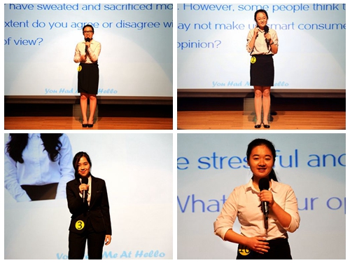 大赛的第一个环节是有备演讲,通过观看一段有关惠子与庄子对一个大葫芦作用的意见不一的视频,发表自己的意见。选手们各抒己见,1号选手余凯盈、3号选手林文娟和4号选手于清平不约而同地选择了打破思维的条框这一角度来论述,但重点各异,各有亮点;5号选手曾慧萍则阐述了创造性思维的重要性以及如何培养这种思维方式;6号选手陈育仪则围绕不要放弃自己的信念这一话题,认为不要太在意别人的对自己的贬低态度,坚持自己的革新观点;8号选手何嘉慧的角度引人深思,应该如何看到“没用”的价值,要从多角度看待事物,在问答环节针对评委问的“是否要消极对待现状?”做出更加深刻详细的解释。