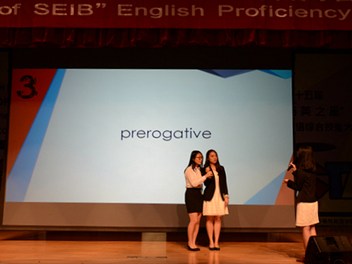 整场比赛引起了观众最大热情的要数第二环节:猜词。每个队需要一个同学对所给词汇进行描述,其余同学则根据描述猜出单词,限定时间里猜对单词数量多者获胜。在此环节中首先登场的“Cosmic”队采用首字母、词性和释义三者结合的方法对单词进行描述,方法得当,准确率高,一连猜出了多个较长的单词,引来观众一阵掌声。其他队伍也各显神通,使用的方法大有不同。“Everglow”队热衷于通过列举同义词来进行提示,队员之间配合默契,大大减少了猜词时间,猜词速度之快赢得了观众们的连连赞叹!