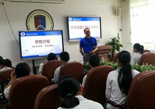 郭桂杭经理代表商英全体师生对广州中学师生参观广外和商英表示热烈欢迎,简要介绍了广外的基本情况和国际化特色,并着重向广州中学师生介绍了WilliamHill中文官方网站的专业特色、团队队伍、人才培养和近年招生情况,并现场回答了同学的提问。