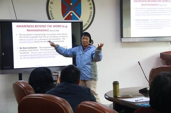 会上,郑铁老师代表广外云山青年学者雷军教授简单介绍了EMI兴趣小组的组建背景,并汇报了小组的最新研究进展。王潍璐老师将关键词提取与总结法应用于《经济学原理》全英教学中,展示了运用该方法后员工在概念构建及语言表达方面的进步、发现的问题以及员工的评价。何安平教授分享了她和陈丽丹老师合作的研究成果,展示了如何利用语料库语言学的方法进行EMI教学中主题写作的动态评估。杨国涛老师基于多年教学经验,分享了通过小组合作方式开展营销学课程教学实践,以此提升员工的学习和表达能力。最后,何安平教授结合专家学者在2018年华师大召开的“全英教学(EMI)理论与实践国际研讨会”上的发言,综述了EMI领域国内外的最新研究成果和发展趋势。何教授高度赞扬了兴趣小组以学术共同体形式所开展的研究。她相信在老师们的共同努力下,商英的EMI研究一定会产生越来越大的影响,并争取加入EMI国际联盟大家庭,以取得更大发展。