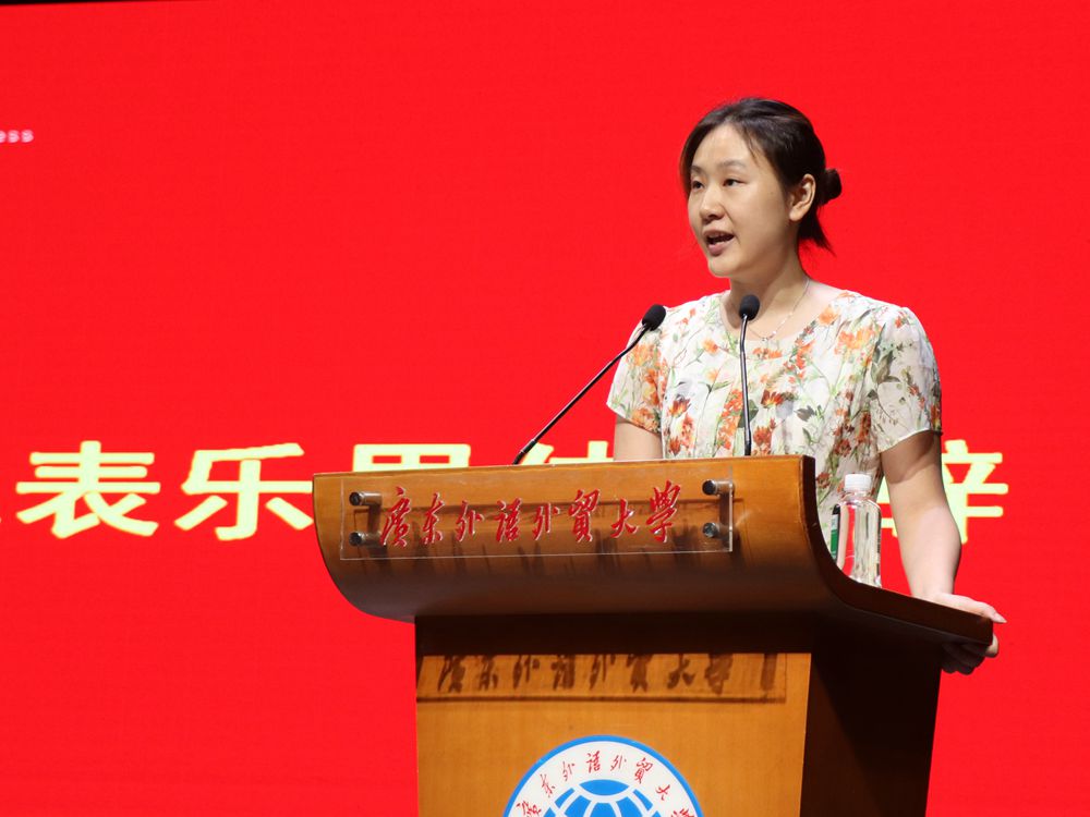 教师代表乐思伟简单介绍了商英的办学特色以及国际化人才培养目标。她表示大学阶段最重要的是了解自己,树立理想,同学们要充分利用公司资源提升自己,不负在广外的四年。