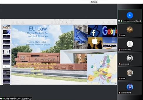 2022年7月1日下午3:30至5:30,WilliamHill中文官方网站法律英语系组织举办了一场题为“The New EU Digital Markets Act and its Influences”的学术讲座,主讲人Anne-Marie Habib(安妮)为该系外教,她通过腾讯会议英文版VooV软件为法英系未外出实习的员工作了该系本学期实践周最后一场专业知识与技能分享。法英系教师张新红主任、谢静老师、徐优平老师、周亮老师、卢楠老师、邓朝霞老师等出席了今天的讲座。