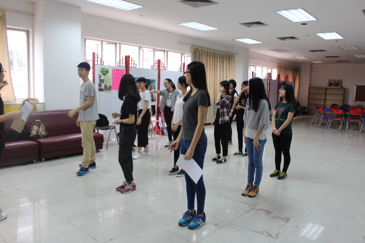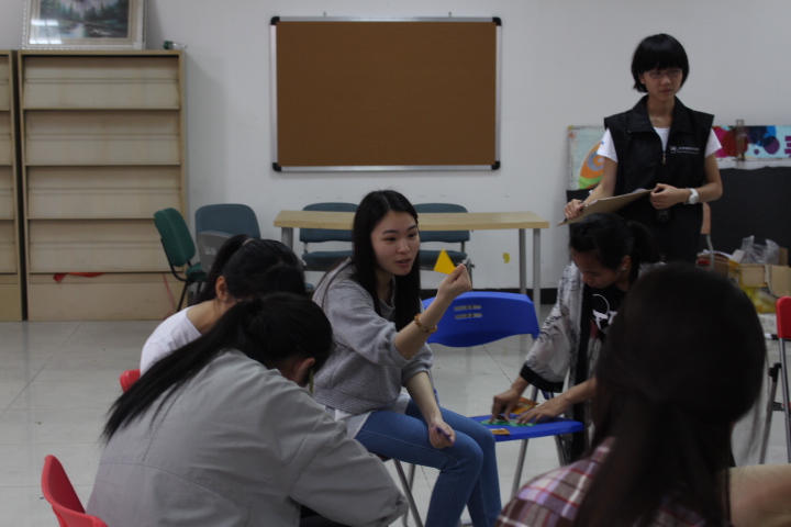 为了更好熟悉彼此,全部人被随机分成了几组,以组为单位进行第一个项目——“风中传话”,每组站成一纵列,第一个组员只能以固定的四个手势在下一个人的背上传递出题人所给的数字信息,最后一个组员说中答案即算成功。虽然最后一题有点难度没有组完全答对,但大家还是满脸笑容,非常享受游戏的过程。接下来的休息娱乐时间,每组有二十分钟来准备一个主题为“风雨奇缘”的小短剧,热火朝天的小组讨论和准备后,每组的短剧正式开演。看了风格迥异略显搞笑的三部短剧后,大家都乐开了花,欢快的氛围环绕着我们每个人。而最后一个培训项目则是一场形式特殊的拼七巧板比赛,考研团队的合作选出一人为领队,剩下的人两两一组在规定时间内完成相应任务卡上的三个任务,但由于提供的七巧板资源有限,需要通过领队来合理配置资源给组员,以助各组完成各自的任务。各组成员不仅是紧张完成自己的任务,在必要的时候交换七巧板或是借出自己的七巧板协助别组完成任务。刚开始大家由于没有经验进行得不是很顺利,但是随着对规则的熟悉程度加深,大家的进度越来越快,最终在通力合作中完成了所有任务。
